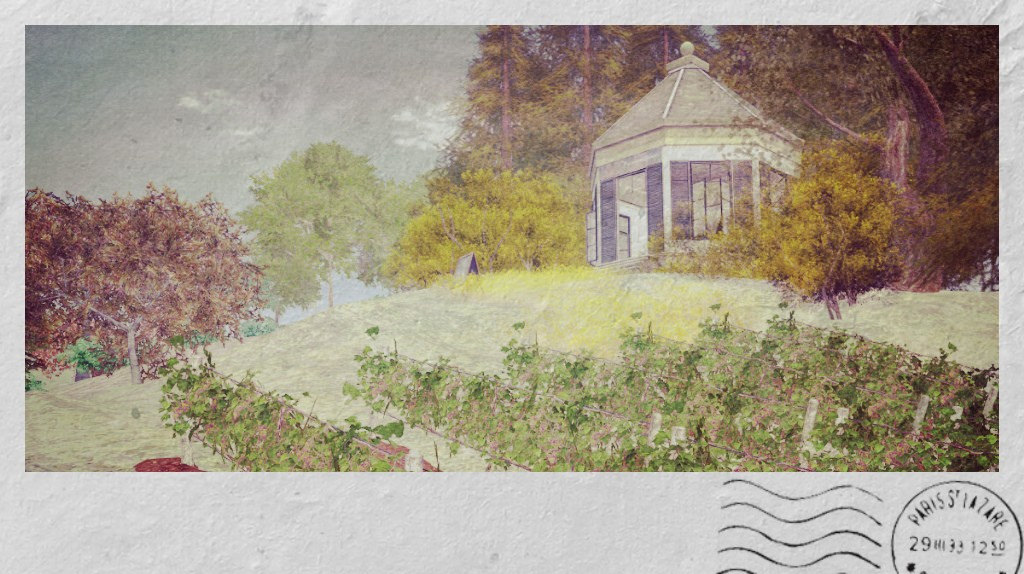 I rezzed a few pine trees. Set out a few chairs. Found a little vintage-ish booth where I could serve coffee and a few treats.